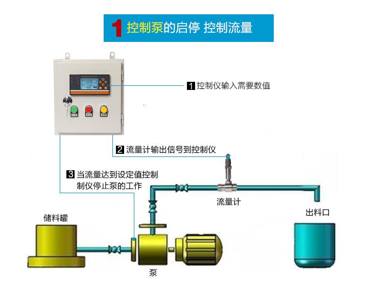 通過流量計測量流量 ,控制儀表接收信號,在控制儀表里設置定量值。定量值達到后電磁閥、水泵 斷電停止工作。