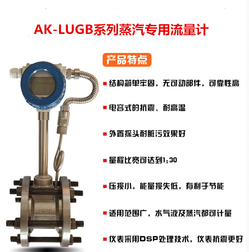 蒸汽流量計無可動部件,可靠性高,長期運行十分可靠。安裝簡單,維護十分方便。檢測傳感器不直接接觸被測介質(zhì),性能穩(wěn)定,壽命長。輸出是與流量成正比的脈沖信號,無零點漂移,精度高。測量范圍寬,量程比可達1:10。 壓力損失較小,運行費用低,更具節(jié)能意義。 在一定的雷諾數(shù)范圍內(nèi),輸出信號頻率不受流體物理性質(zhì)和組份變化的響,儀表系數(shù)僅與旋渦發(fā)生體的形狀和尺寸有關,測量流體體積流量時無需補償,調(diào)換配件后一般無需重新標定儀表系數(shù)。 應用范圍廣,蒸汽、氣體、液體的流量均可測量。 檢定周期為二年。