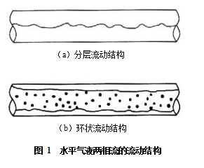 當流速特別高的時候,也會表現為環狀流動,即管壁上有液膜,管道中心部分為帶液滴的氣核,由于水平流動時重力的影響作用,下部液膜要比上部管壁的厚,如圖1b)所示。