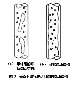 在垂直下降管道中,氣液兩相流動的結構與作垂直上升流動時的結構很相似,但有不同,不僅流動方向相反,而且在平均流速相同的情況下,垂直下降管道中液體的流速比垂直上升管道中液體的流速快得多。