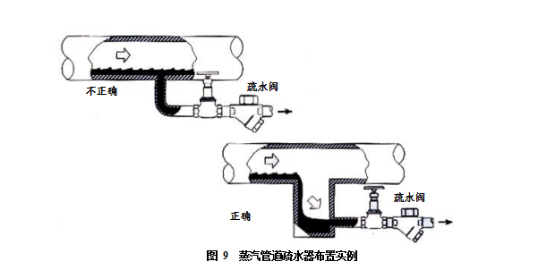 疏水點的合理布置對充分疏水有關鍵性的作用。在圖9a)所示的實例中,凝結水的捕捉口太細,與蒸汽一起高速流動的凝結水,可能會有一部分不被捕捉口所收集,而流到下游。