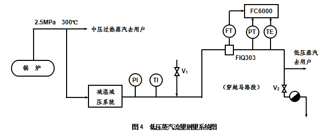 江蘇奧科儀表有限公司在為江蘇的一家藥業公司組建全廠蒸汽計量網的項目中,碰到了一個令人費解的故障,這個故障發生在一個蒸汽流量計測量過熱蒸汽流量的系統中,這個系統的管道連接如圖4所示。